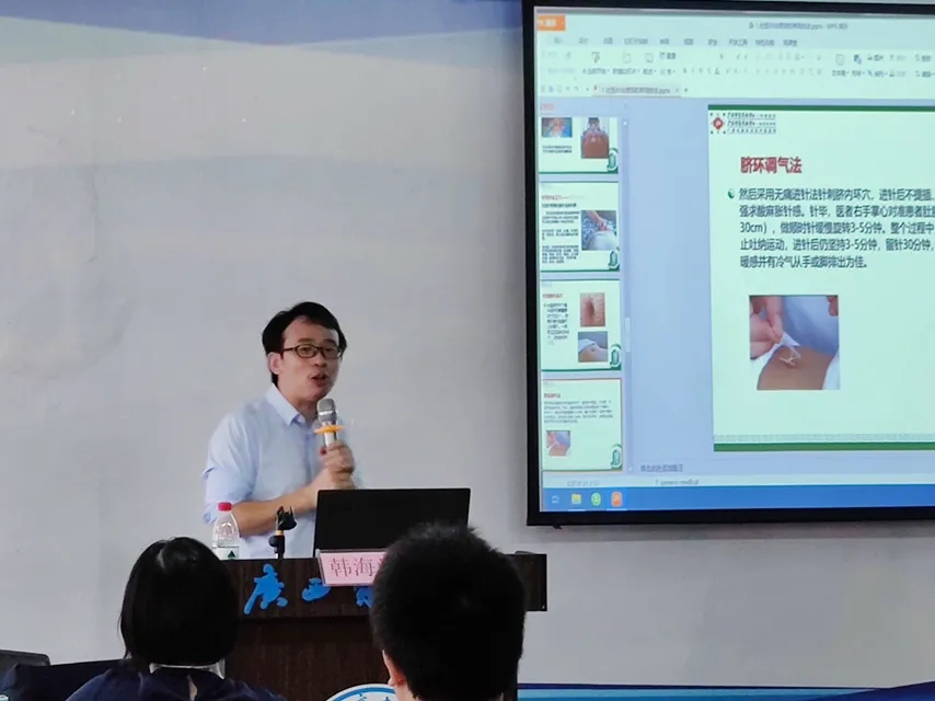 廣西黃氏壯醫(yī)針灸流派主要傳承人,廣西中醫(yī)藥大學第一附屬醫(yī)院壯醫(yī)針灸科副主任韓海濤作《壯醫(yī)臨床適用技術講座》授課,并進行現(xiàn)場教學。