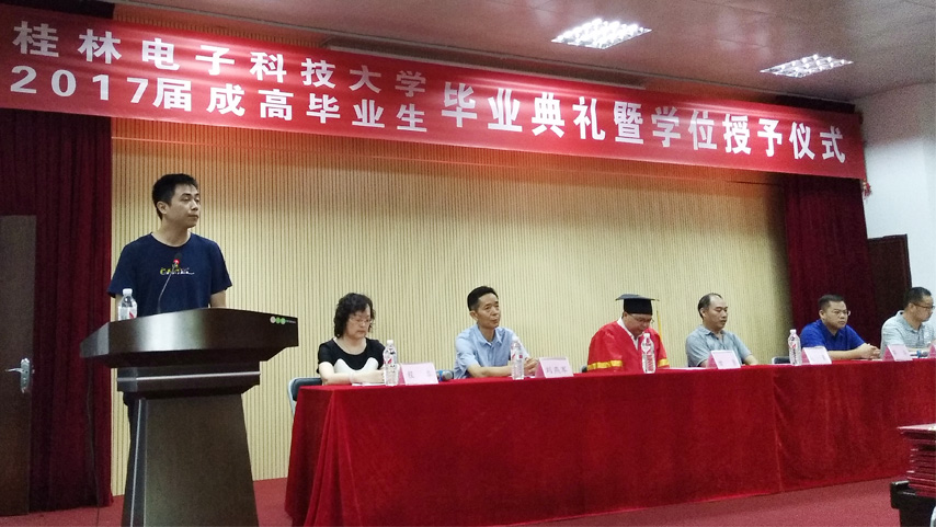 7月9日上午,桂林電子科技大學(xué)2017屆成高畢業(yè)生畢業(yè)典禮暨學(xué)位授予儀式在桂林電子科技大學(xué)東校區(qū)正平科技館一樓報告廳隆重舉行。繼續(xù)教育學(xué)院院長、博士、教授甘勇、副院長劉燕軍、向榮、院辦主任程華出席典禮,育才教育黨支部書記、董事長蔣華及近200名畢業(yè)生代表參加了典禮,典禮由學(xué)歷部主任張勇主持。